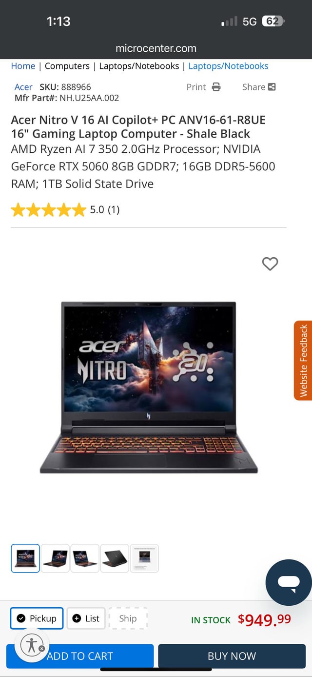 Acer Nitro V 16 AI Copilot+ PC ANV16-61-R8UE 16″ Gaming Laptop Computer – Shale Black; AMD Ryzen AI 7 350 2.0GHz Processor; NVIDIA GeForce RTX 5060 8GB GDDR7; 16GB DDR5-5600 RAM; 1TB Solid State Drive